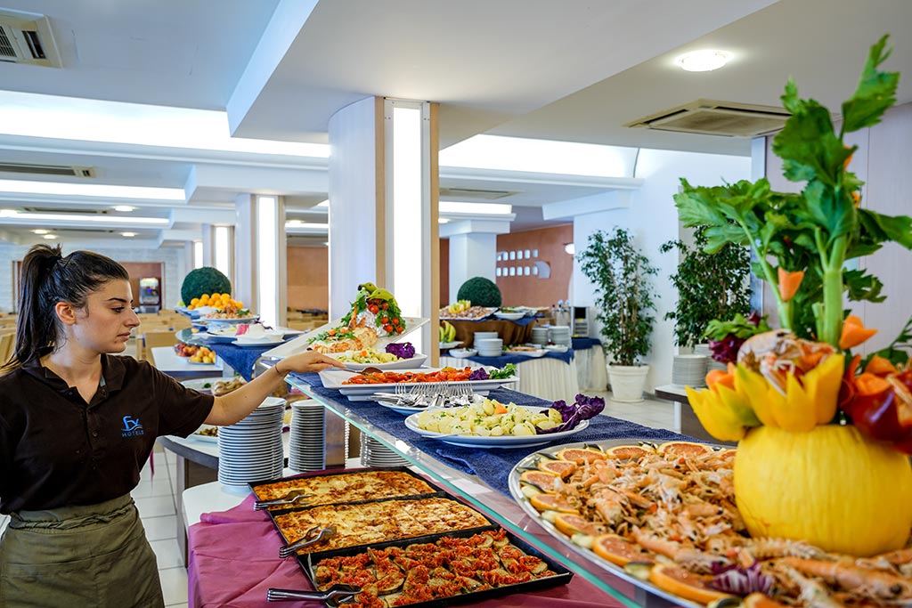 Pensione Completa con bevande ai pasti (acqua mineralizzata in caraffa, soft drink, succhi e vino alla spina) ° Open bar dalle 9.00 alle 23.00 con soft drink, acqua e succhi alla spina serviti alla mescita ° Snack pomeridiano ad orari stabiliti presso il bar piscina.