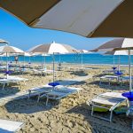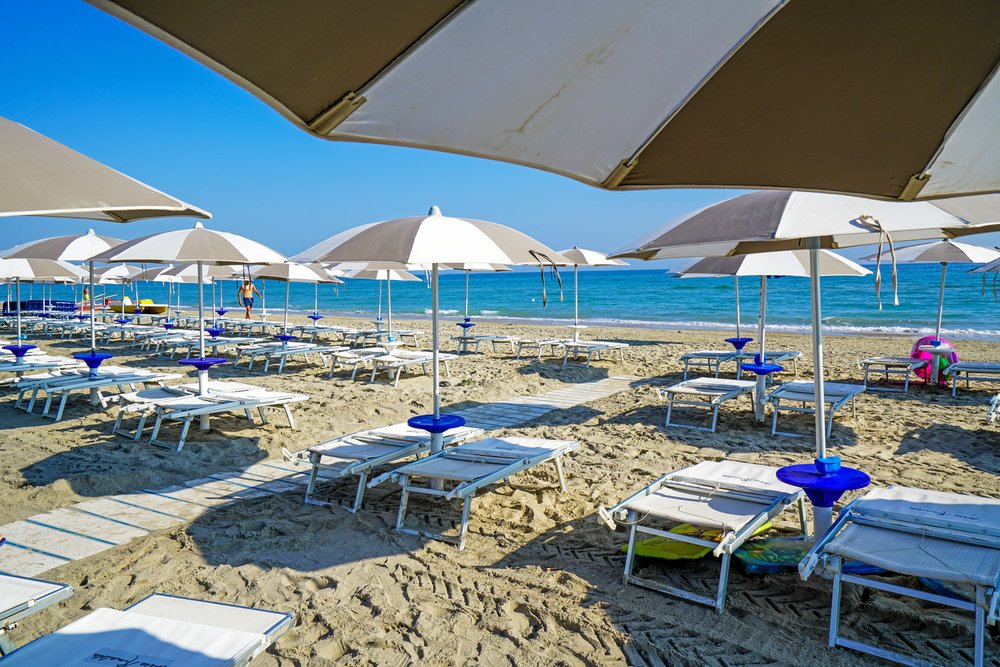 Con accesso diretto, di sabbia, privata e attrezzata. Servizio spiaggia incluso nelle quote a partire dalla 2° fila (1 ombrellone + 2 lettini ad unità abitativa, ad esaurimento).